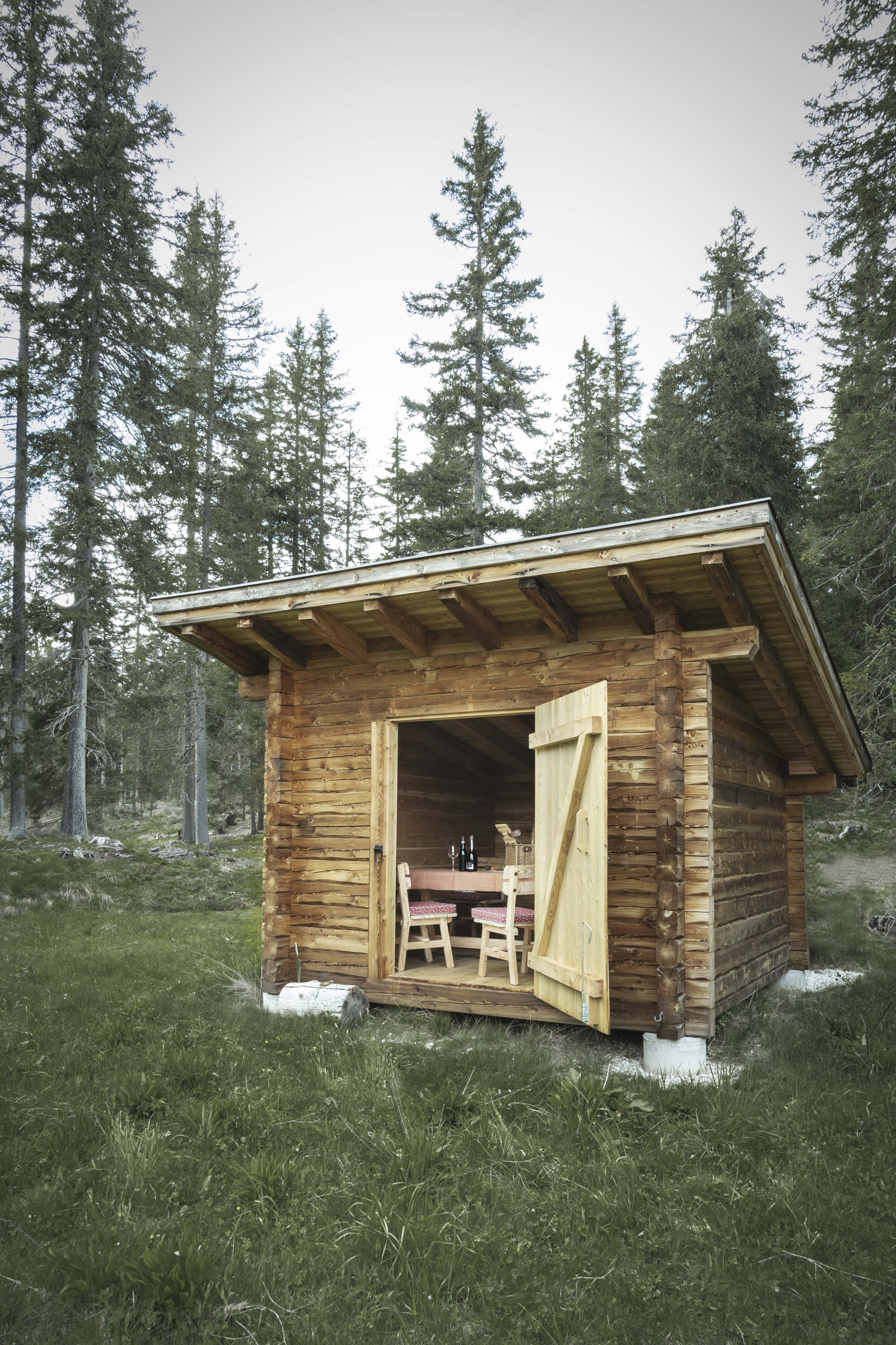 Nel bosco circostante, tre tabià privati regalano spazi esclusivi per momenti di relax e picnic immersi nella natura.